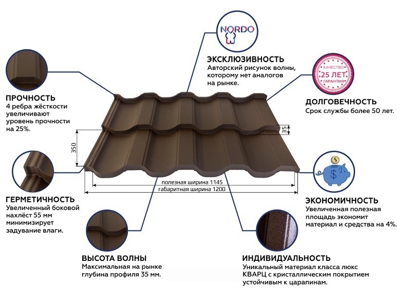 Характерной чертой металлочерепицы НОРДО является ее волна, высотой 35мм.